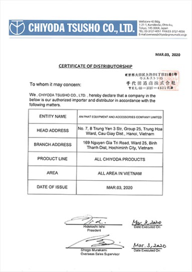 An Phát là nhà phân phối chính thức các sản phẩm Chiyoda tại thị trường Việt Nam. Với vai trò phân phối độc quyền, An Phát cam kết cung cấp 100% các sản phẩm Chiyoda chính hãng, có nguồn gốc xuất xứ rõ ràng. An Phát áp dụng chính sách bảo hành 12 tháng theo tiêu chuẩn của Chiyoda. Với kinh nghiệm nhiều năm trong lĩnh vực công nghiệp, An Phát là sự lựa chọn đáng tin cậy để khách hàng mua sản phẩm Chiyoda chính hãng.