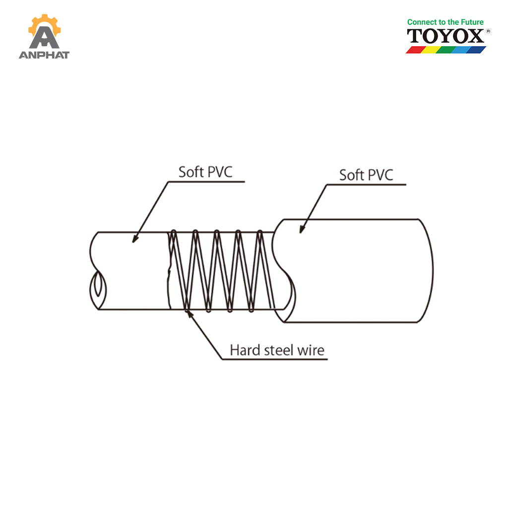 - Cấu trúc gân thép chống gãy gập và chống xẹp: Toyox TS được gia cường bằng dây thép cứng bên trong, giúp ống duy trì hình dạng ổn định cả trong trường hợp áp suất âm (chân không) và áp suất dương. Điều này giúp hạn chế tình trạng xẹp ống, đảm bảo dòng chảy liên tục và ổn định.
