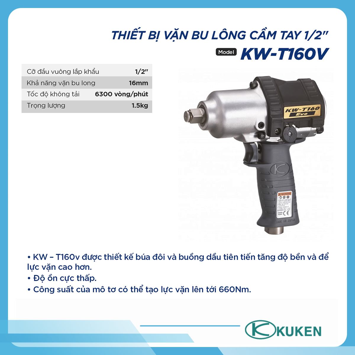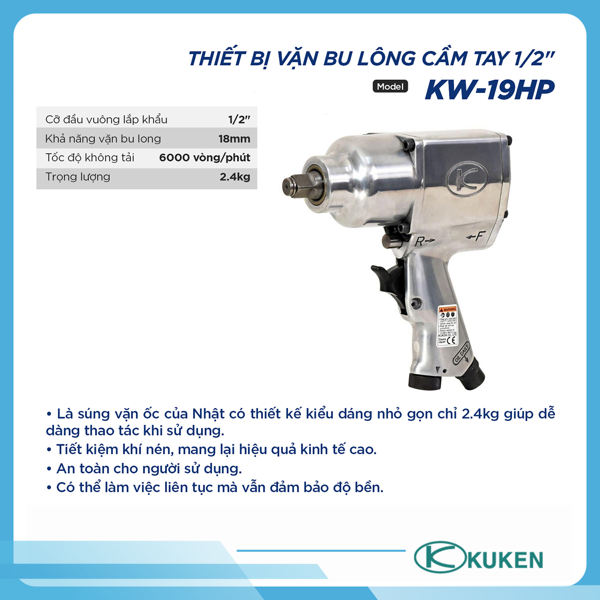 Súng vặn bulong khí nén 1/2" Kuken - Nhật Bản là dụng cụ khí nén chất lượng cao, nổi bật với thiết kế nhỏ gọn, lực siết mạnh và độ bền vượt trội. Sản phẩm phù hợp cho gara ô tô, xưởng cơ khí và sản xuất công nghiệp.