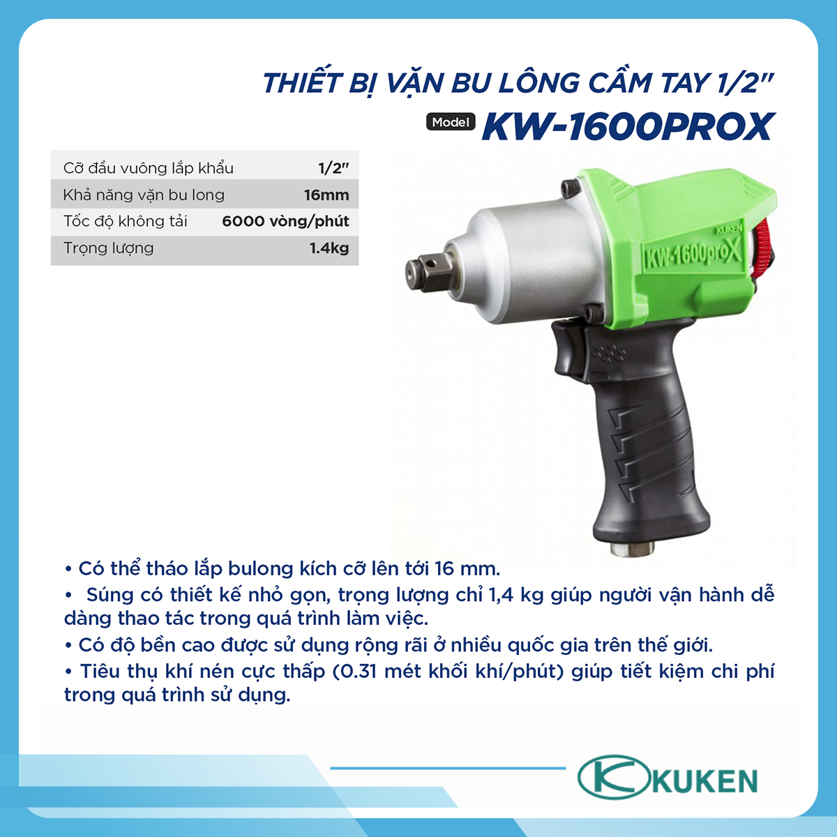 Trong số các dòng trên thị trường, súng vặn bulong khí nén 1/2" Kuken được đánh giá cao nhờ những đặc điểm vượt trội: