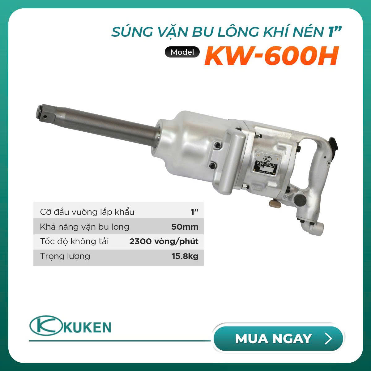 Đây là dòng súng 1 inch chuyên dùng để xử lý những loại bu lông cỡ lớn 50mm của xe tải nặng, xe container, máy công trình,.... Được làm bằng chất liệu hợp kim nhôm nên có trọng lượng siêu nhẹ, KW-600H chỉ nặng có 15,8 kg thuận tiện trong quá trình thao tác, làm việc.