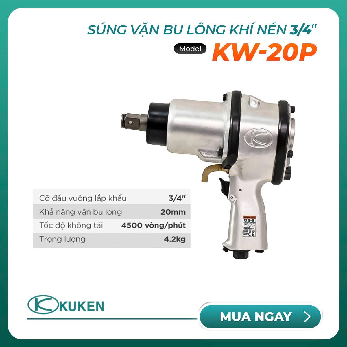 Súng vặn ốc khí nén 3/4 inch KW-20P là sự lựa chọn phù hợp cho những hiệu làm lốp xe du lịch, xe tải nhỏ, các gara sửa chữa ô tô, xưởng cơ khí,... Cỡ đầu vuông 3/4 inch kết hợp lực siết khỏe và đều giúp tháo lắp nhanh chóng các loại bu lông 20mm.