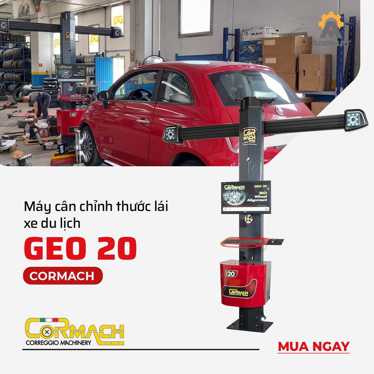 Cormach GEO-20 là thiết bị cân chỉnh độ chụm bánh xe đến từ Italia, nổi bật với hệ thống camera độ phân giải cao và phần mềm thân thiện với người dùng. Máy được thiết kế để căn chỉnh nhanh chóng dành cho xe con và xe du lịch.